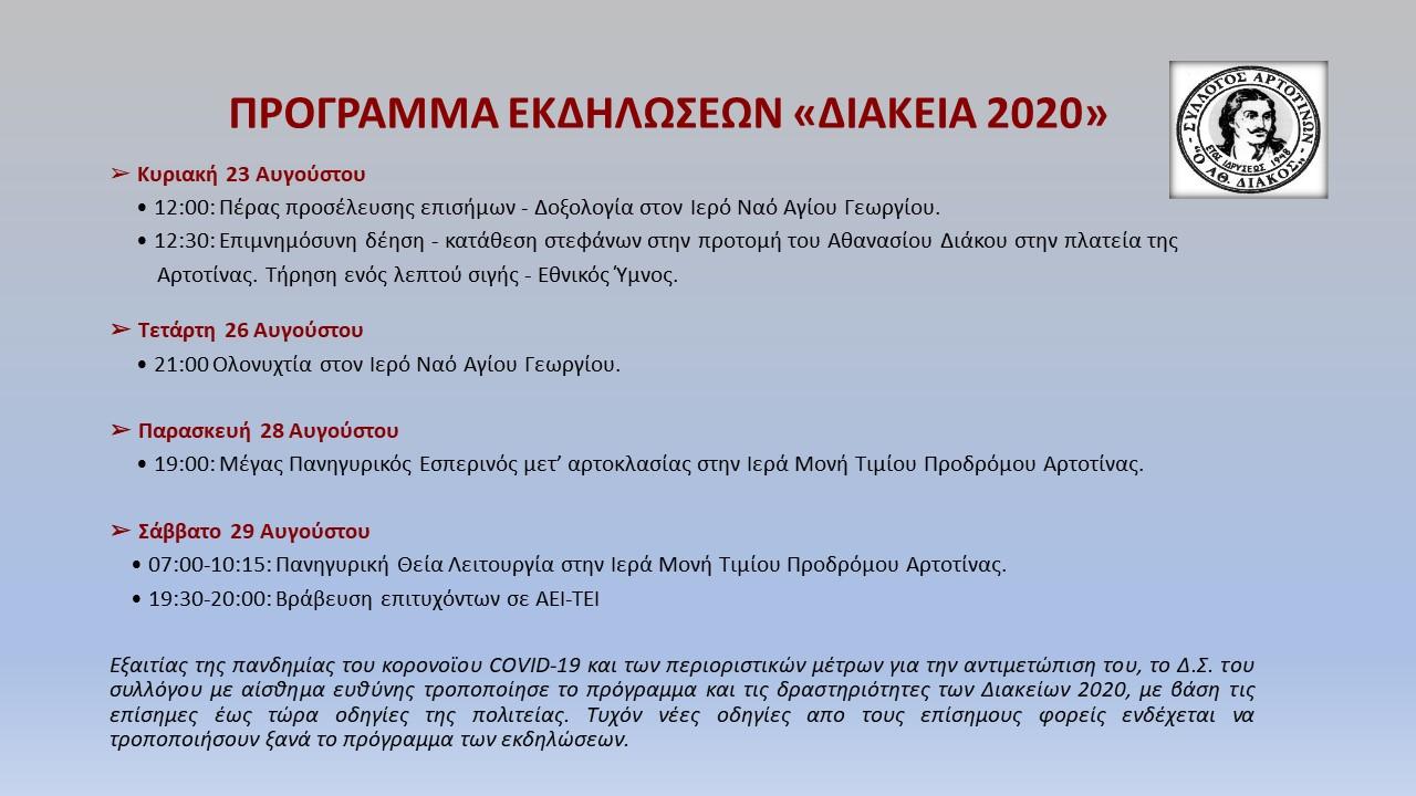 Οι εκδηλώσεις για τα “Διάκεια 2020” στην Αρτοτίνα ΚΟΙΝΩΝΙΚΑ Από doridanews Στις Αυγ 10, 2020 Share - Διαφήμιση -Χρόνος ανάγνωσης: 1 λεπτό Συνεχίστε να διαβάσετε- Διαφήμιση - Share