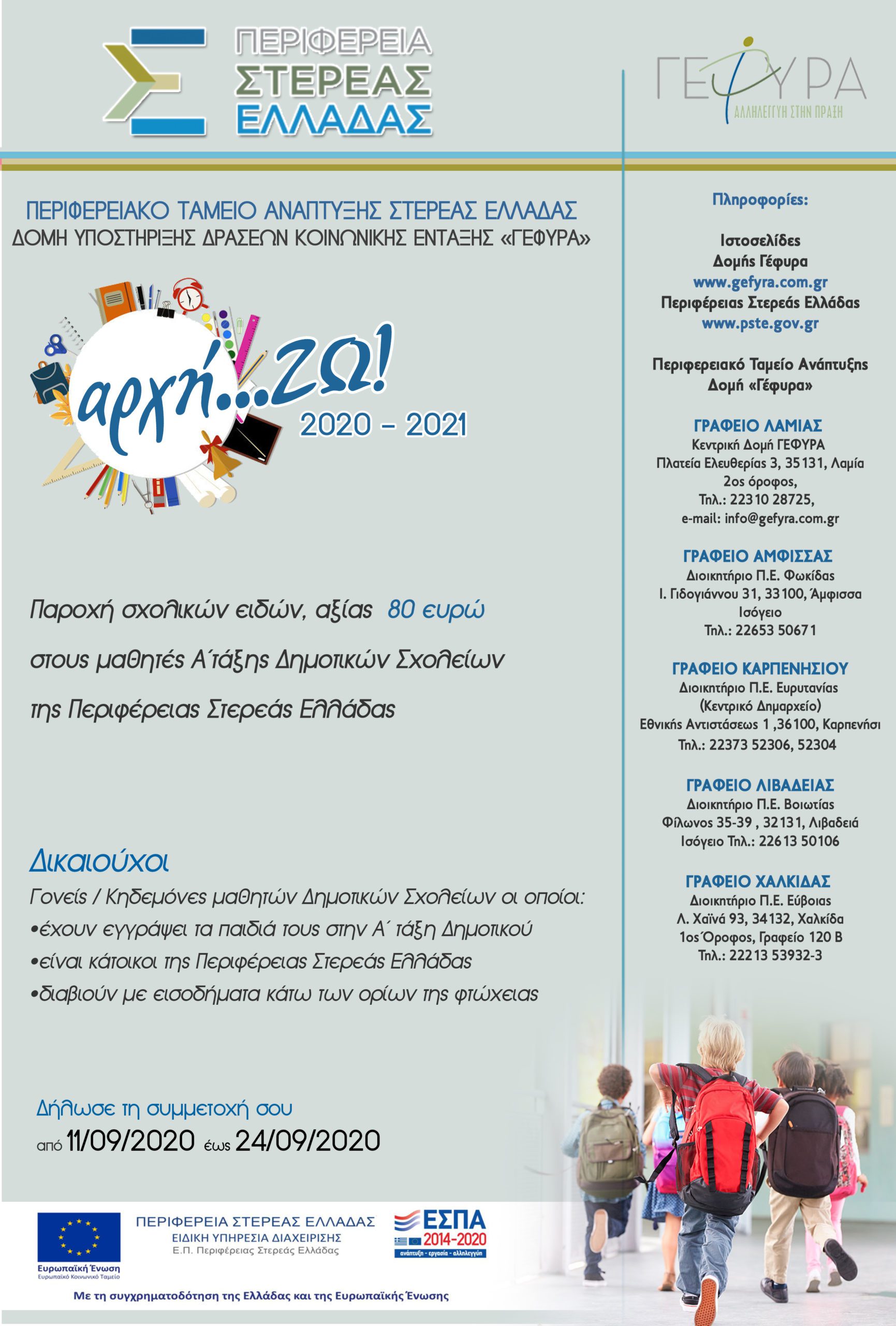 Η Δράση «αρχή…ΖΩ» υλοποιείται από την Περιφέρεια Στερεάς Ελλάδας με πόρους του Ευρωπαϊκού Κοινωνικού Ταμείου και αφορά την παροχή έκτακτου οικονομικού βοηθήματος (80 € εφάπαξ) για την αγορά σχολικών ειδών από τα παιδιά της Α’ τάξης Δημοτικών Σχολείων, έτους 2020-2021, μέλη οικογενειών της Περιφέρειας Στερεάς Ελλάδας, που διαβιούν κάτω από τα όρια της φτώχειας.