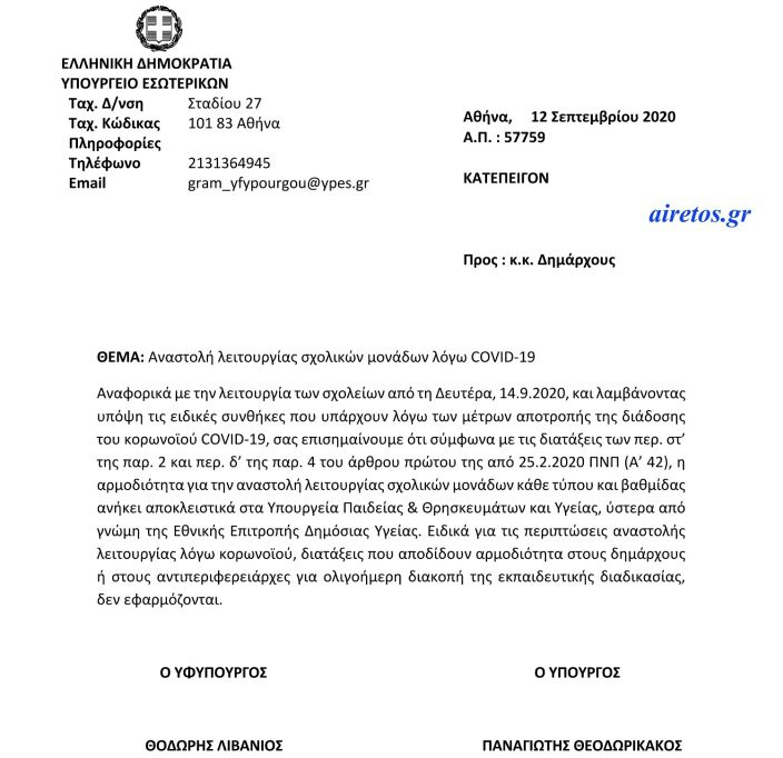 Έγγραφο με την ένδειξη “κατεπείγον” απέστειλαν στους Δημάρχους το Σάββατο 12 Σεπτεμβρίου από κοινού ο Υπουργός και ο Υφυπουργός Εσωτερικών, με θέμα την “αναστολή λειτουργίας σχολικών μονάδων λόγω COVID-19”.