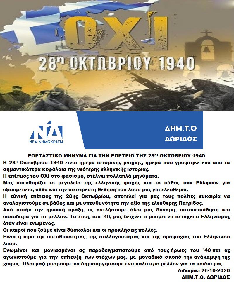 ΔΗΜ.Τ.Ο. ΝΔ ΔΩΡΙΔΟΣ : εορταστικό μήνυμα για την επέτειο της 28ης Οκτωβρίου