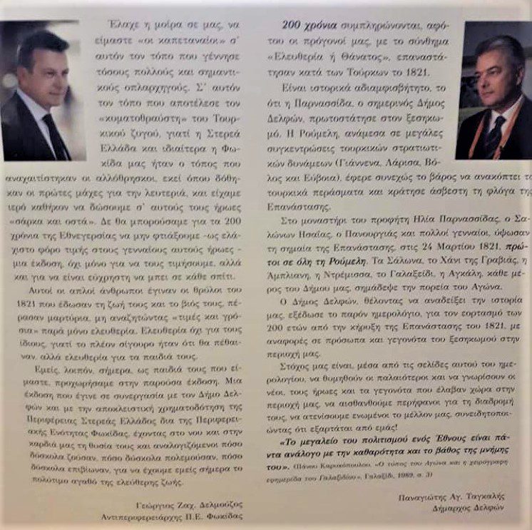 Οι πρόλογοι Αντιπεριφερειάρχη και Δημάρχου Δελφών στο ημερολόγιο