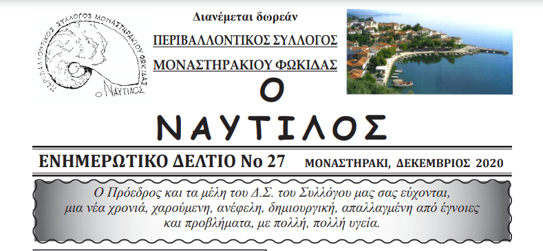 Κυκλοφόρησε το 27 τεύχος της ενδιαφέρουσας εφημερίδας «Ο Ναυτίλος» που εκδίδει ο ομώνυμος Περιβαλλοντικός Σύλλογος Μοναστηρακίου Δωρίδας και επιμελείται ο Δημήτρης Κωσταράς.