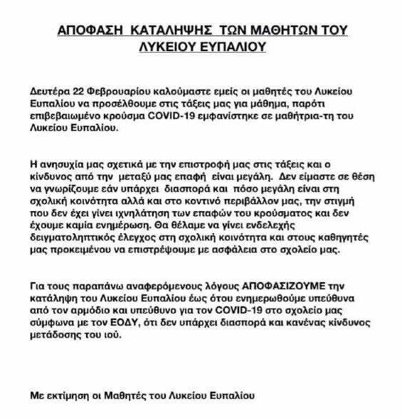 Κατάληψη του Λυκείου Ευπαλίου από τους μαθητές του – Αύριο Τρίτη θα γίνουν Rapid Test σε όλους τους μαθητές