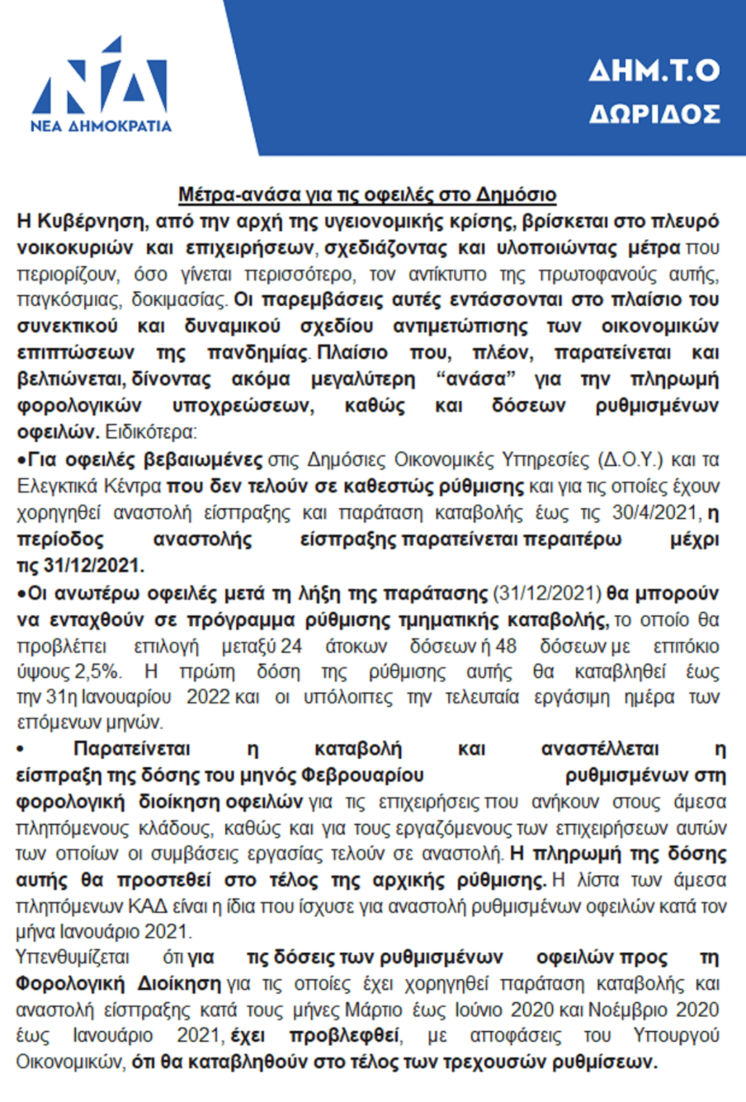 Ν.Δ. ΔΩΡΙΔΑΣ-Μέτρα-ανάσα για τις οφειλές στο Δημόσιο
