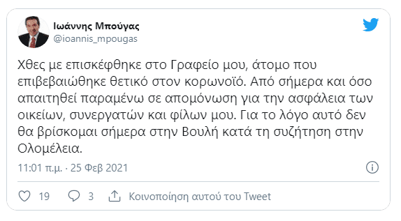 «Χθες με επισκέφθηκε στο Γραφείο μου, άτομο που επιβεβαιώθηκε θετικό στον κορωνοϊό. Από σήμερα και όσο απαιτηθεί παραμένω σε απομόνωση για την ασφάλεια των οικείων, συνεργατών και φίλων μου. Για το λόγο αυτό δεν θα βρίσκομαι σήμερα στην Βουλή κατά τη συζήτηση στην Ολομέλεια».