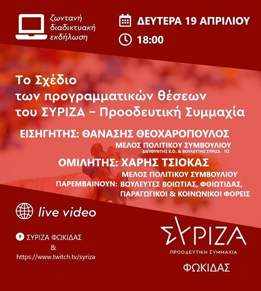 ΣΥΡΙΖΑ-ΠΣ ΦΩΚΙΔΑΣ: Διαδικτυακή εκδήλωση τη Δευτέρα για τις Προγραμματικές Θέσεις  του κόμματος