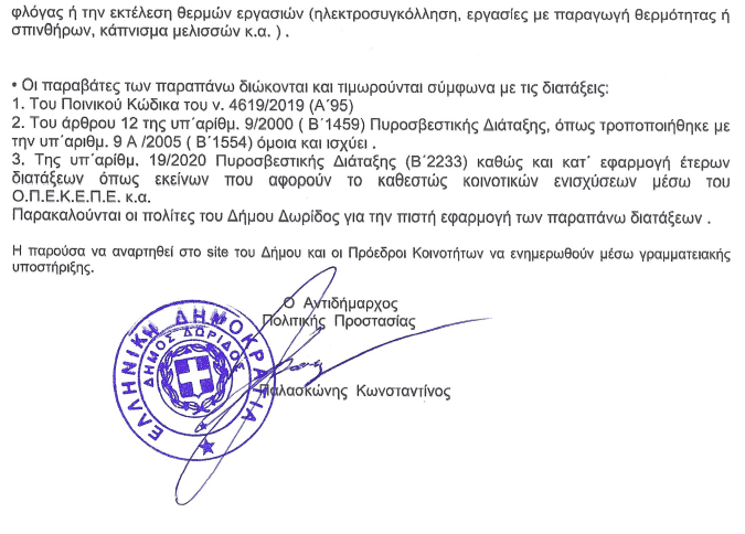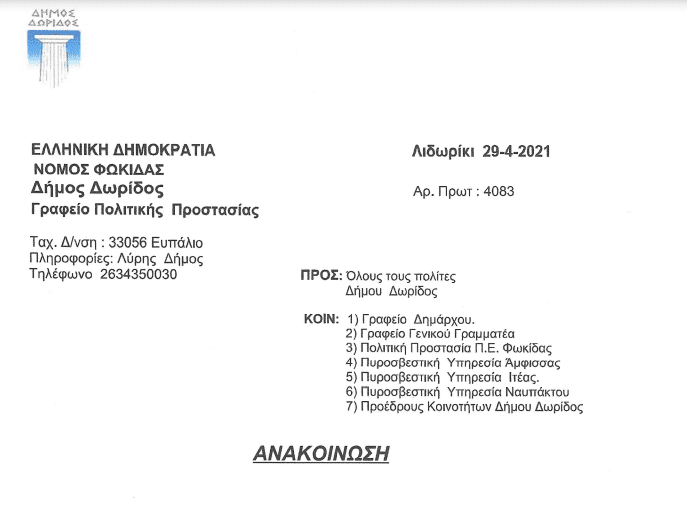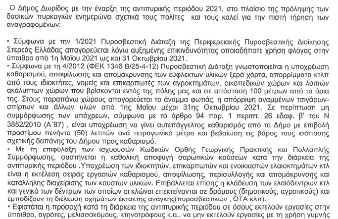 Με ανακοίνωσή του ο αρμόδιος Αντιδήμαρχος Πολιτικής Προστασίας Κώστας Παλασκώνης δίνει τις κατευθυντήριες γραμμές που πρέπει όλοι να ακολουθήσουμε ώστε να αποφευχθούν οι πυρκαγιές και να προστατέψουμε τη Δωρίδα την καλοκαιρινή περίοδο.