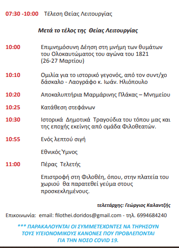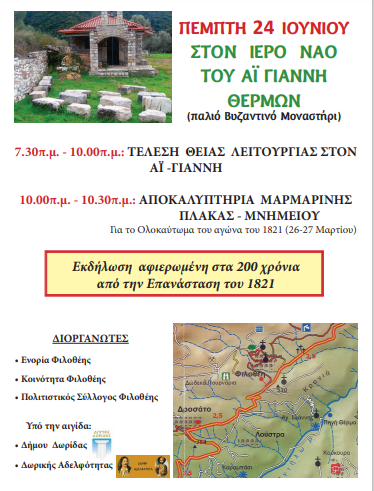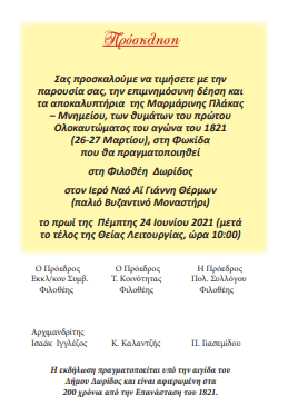 Αποκαλυπτήρια Μαρμάρινης Πλάκας-Μνημείου στη Φιλοθέη Δωρίδας την Πέμπτη 24 Ιουνίου ΠΟΛΙΤΙΣΜΟΣ Από doridanews Στις Ιούν 21, 2021 Share - Διαφήμιση -Χρόνος ανάγνωσης: 3 λεπτά ΠΡΟΓΡΑΜΜΑ Συνεχίστε να διαβάσετε- Διαφήμιση - Share