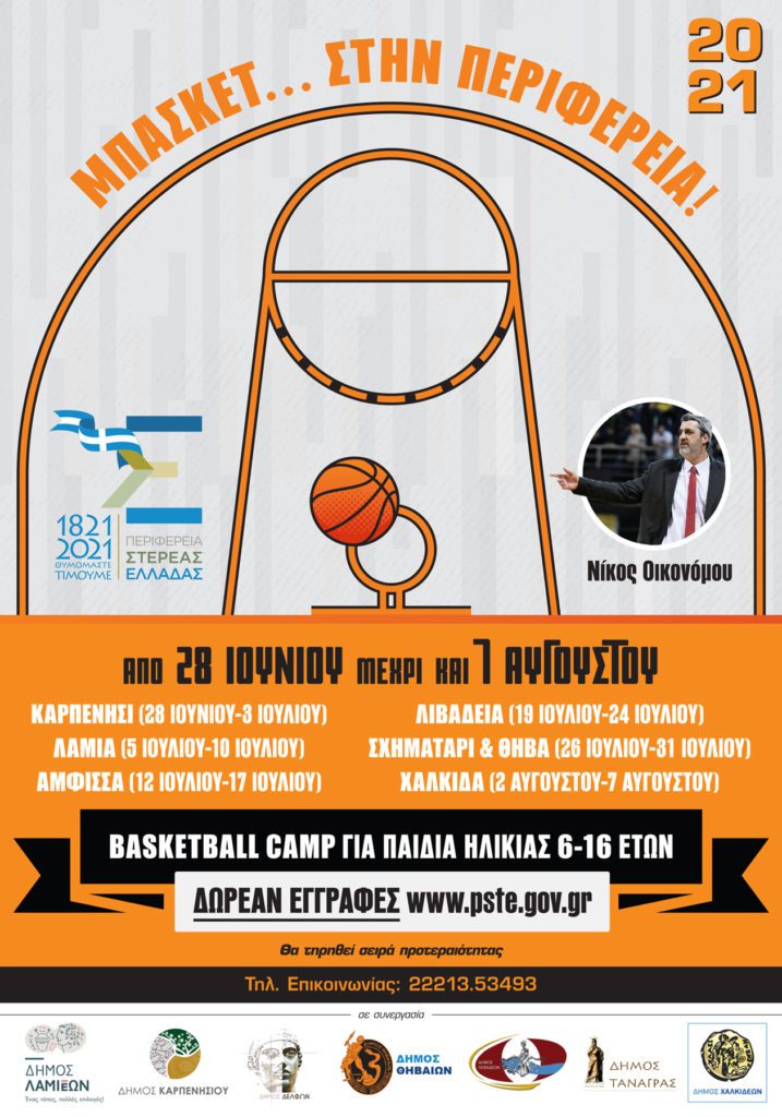 Η Περιφέρεια Στερεάς Ελλάδας διοργανώνει επτά Basketball Camps σε ισάριθμες πόλεις της Στερεάς Ελλάδας, από τις 28 Ιουνίου ως τις 7 Αυγούστου και με “συμπαίκτη” – συνδιοργανωτή τον πρώην διεθνή μπασκετμπολίστα και έμπειρο προπονητή ακαδημιών Νίκο Οικονόμου.