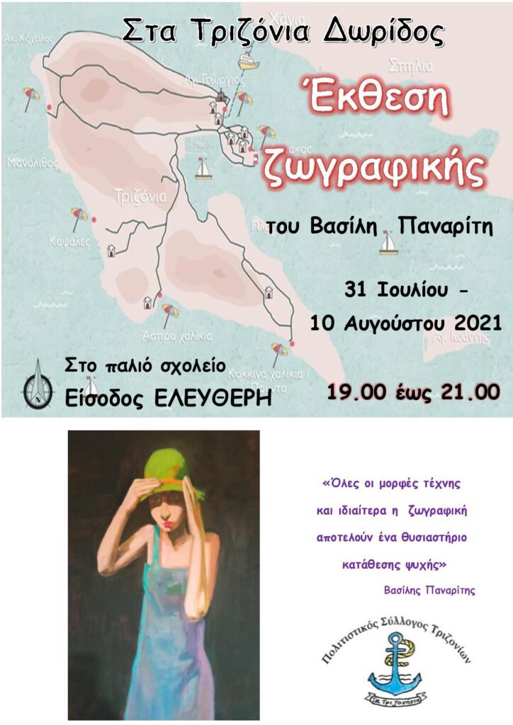 Κάτοικοι, παραθεριστές και επισκέπτες του νησιού ελεύθερα μπορούν να επισκεφτούν την έκθεση ζωγραφικής του Βασίλη Παναρίτη, από 31 Ιουλίου έως 10 Αυγούστου 2021, ώρα 19.00 έως 21.00.