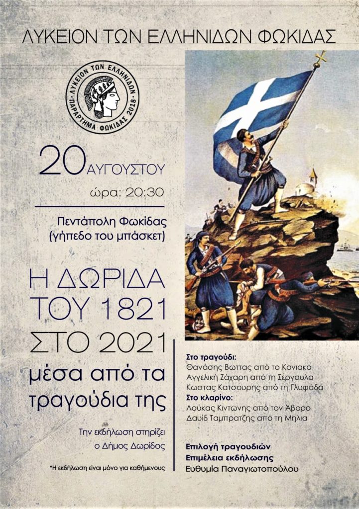 Σας καλούμε στην εκδήλωσή μας με τίτλο “Η ΔΩΡΙΔΑ ΤΟΥ 1821 ΣΤΟ 2021 ΜΕΣΑ ΑΠΟ ΤΑ ΤΡΑΓΟΥΔΙΑ ΤΗΣ” που θα πραγματοποιηθεί στις 20 Αυγούστου στο γήπεδο μπάσκετ Πενταπόλεως και ώρα έναρξης 20:30.