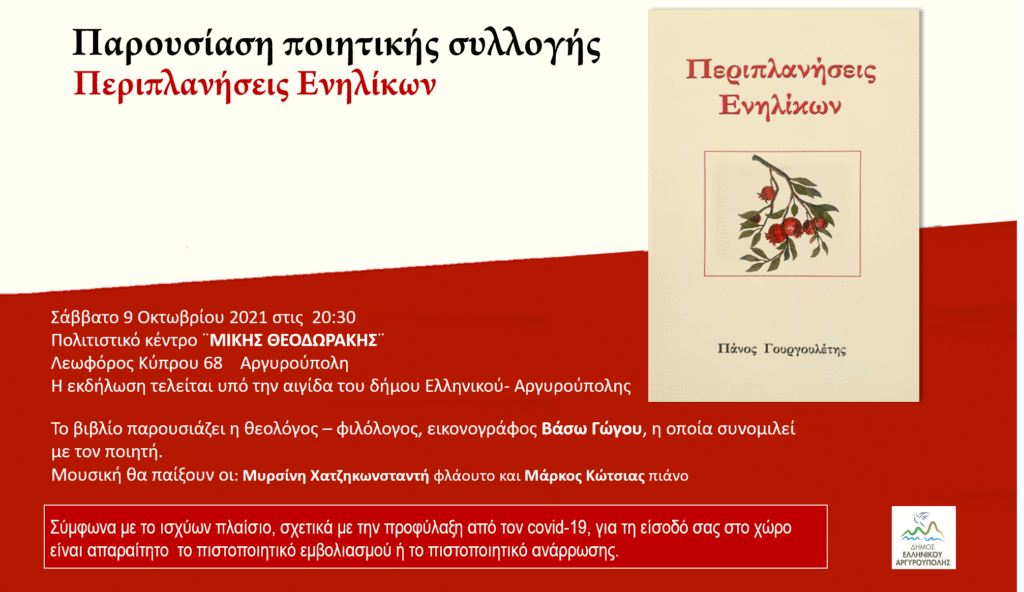 Την ποιητική του συλλογή παρουσιάζει ο Πάνος Γουργουλέτης το Σάββατο 9 Οκτωβρίου και μας προσκαλεί σε μια ωραία εκδήλωση.