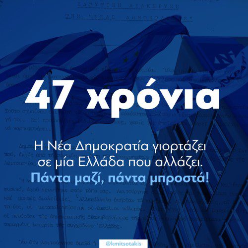 Όσοι ανήκουμε στη Νέα Δημοκρατία, με πίστη στις ιδρυτικές αρχές και αξίες της, μεγαλώνουμε την παράταξη μας, ανανεωνόμαστε, εξελισσόμαστε και αισιοδοξούμε για το μέλλον της πατρίδας μας.