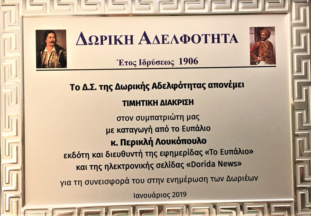 2. Να υπενθυμίσουμε τέλος ότι ο Διευθύνων το DORIDA News, δημοσιογράφος Περικλής Λουκόπουλος, έχει τιμηθεί από το σημερινό Δ.Σ. για την “συνεισφορά του στην ενημέρωση των Δωριέων”.