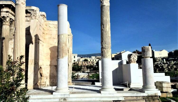 Βγαίνοντας από το σταθμό στο Μοναστηράκι της Αθήνας και ανηφορίζοντας προς τη Ρωμαϊκή αγορά, στέκεται επιβλητικά η Βιβλιοθήκη του Αδριανού. Κατασκευάστηκε το 132-134 μ.Χ. από το, φιλέλληνα και ένθερμο υποστηρικτή των τεχνών, Ρωμαίο αυτοκράτορα Αδριανό.