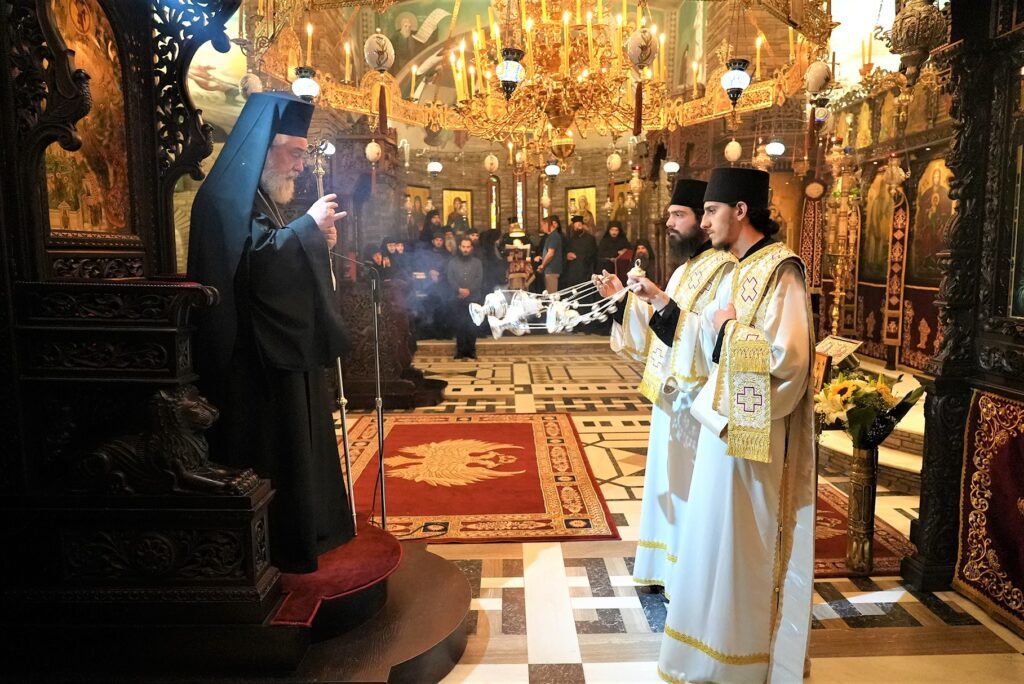 Η πρώτη ευλογία είναι ότι η εορτή τελέστηκε πανευφρόσυνα κατά τη μοναστηριακή τάξη, τόσο στην παραμονή κατά την πανηγυρική Αρχιερατική ακολουθία του Εσπερινού, όπου χοροστάτησε ο σεπτός Ποιμενάρχης μας, Μητροπολίτης Φωκίδος Θεόκτιστος, όσο και ανήμερα της εορτής όπου ο Ποιμενάρχης προεξήρχε της Θείας Λειτουργίας.