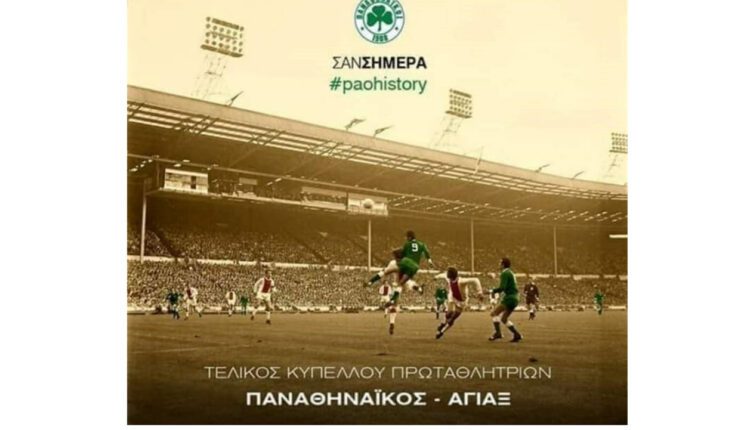 Τέτοια ημέρα πριν από 51 χρόνια η ποδοσφαιρική ομάδα του Παναθηναϊκού Α.Ο., πρωταθλήτρια Ελλάδος, αγωνίστηκε στον τελικό του κυπέλου πρωταθλητριών Ευρώπης (Λονδίνο, στάδιο Γουέμπλεϊ) εναντίον της Ολλανδικής ομάδας του Άγιαξ (αποτέλεσμα 2-0 υπέρ των Ολλανδών), που ήταν τότε η καλύτερη ομάδα της Ευρώπης και ίσως και του κόσμου.
