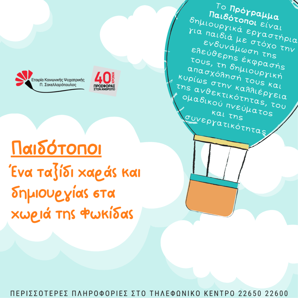 Η Κινητή Μονάδα Ψυχικής Υγείας της Εταιρίας Κοινωνικής Ψυχιατρικής Π. Σακελλαρόπουλος νομού Φωκίδας ανακοίνωσε το νέο πρόγραμμα των Παιδότοπων, των εργαστηρίων δημιουργικής απασχόλησης για παιδιά, που υλοποιεί στο πλαίσιο της πρωτογενούς πρόληψης του προγράμματος Αγωγής Κοινότητας.