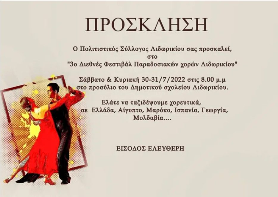 ΛΙΔΩΡΙΚΙ: Το 3ο Διεθνές Φεστιβάλ Παραδοσιακών χορών ΠΟΛΙΤΙΣΜΟΣ Από doridanews Στις Ιούλ 13, 2022 Share - Διαφήμιση -Χρόνος ανάγνωσης: 1 λεπτό Συνεχίστε να διαβάσετε- Διαφήμιση - Share
