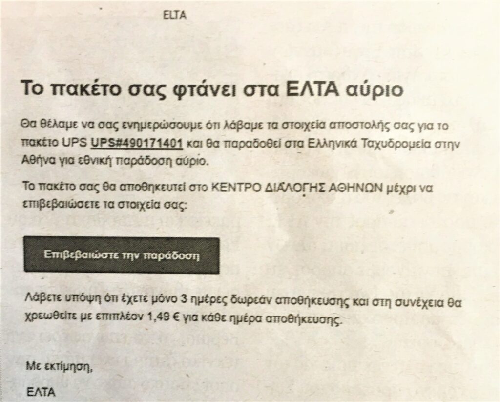 Ο όμιλος των Ελληνικών Ταχυδρομείων εφιστά την προσοχή του κοινού επισημαίνοντας ότι το τελευταίο διάστημα διακινούνται e-mail και SMS που εμφανίζουν ως αποστολέα τα ΕΛΤΑ και με αφορμή μια δήθεν παράδοση δέματος , ζητούν από τους ανυποψίαστους πολίτες να επιβεβαιώσουν τα προσωπικά τους στοιχεία.