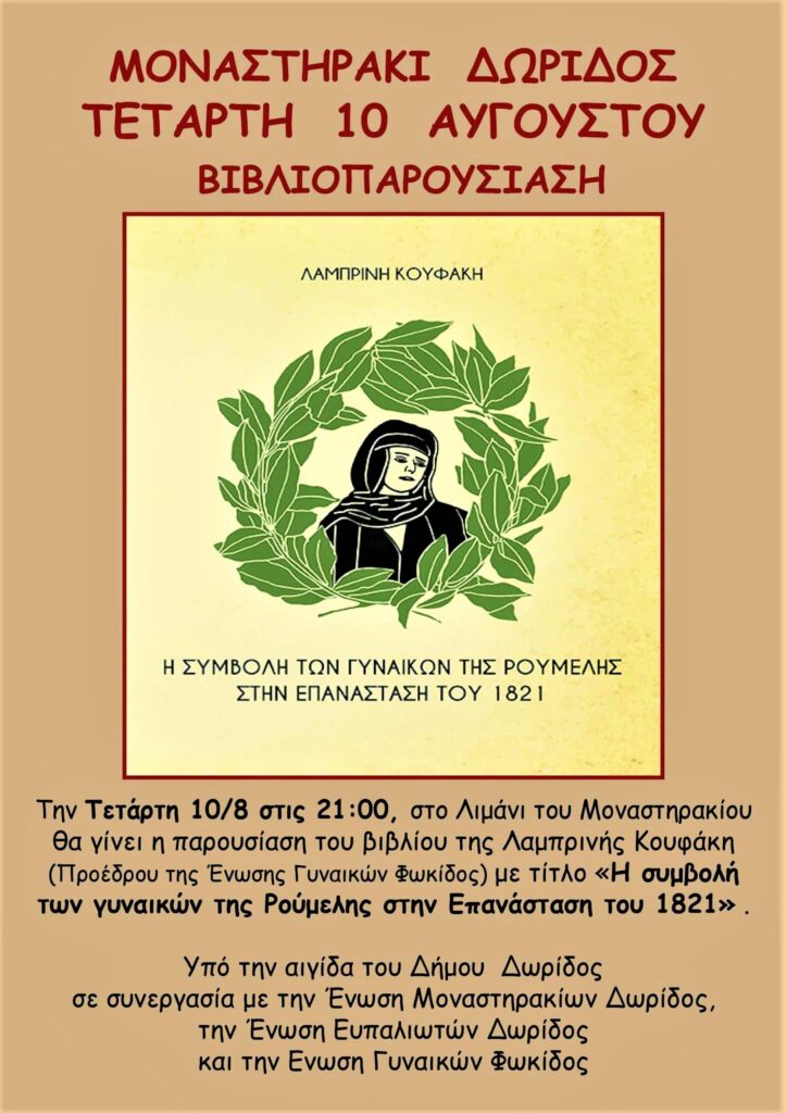 Η Ένωση Μοναστηρακίων Δωρίδος σε συνεργασία με την Ένωση Γυναικών Φωκίδος και την Ένωση Ευπαλιωτών Δωρίδος σας προσκαλούν στη βιβλιοπαρουσίαση της Λαμπρινής Κουφάκη με θέμα :