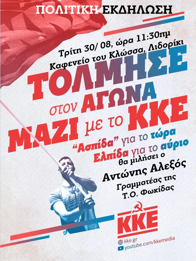 ΚΚΕ – Πολιτική εκδήλωση-ομιλία σήμερα στο Λιδωρίκι ΠΟΛΙΤΙΚΑ Από doridanews Στις Αυγ 30, 2022 Share - Διαφήμιση -Χρόνος ανάγνωσης: 1 λεπτό Συνεχίστε να διαβάσετε- Διαφήμιση - Share