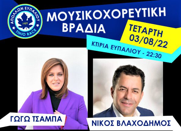 Σήμερα μεγάλη μουσικοχορευτική βραδιά του Απόλλωνα στα “Κτίρια” Ευπαλίου με Γωγώ Τσαμπά, Νεκτ. Κοκκώνη Νεκτ. Κοκκώνη, Ν. Βλαχοδήμο, Έλ. Γεωργαντά και Βασίλη Φλέγγα