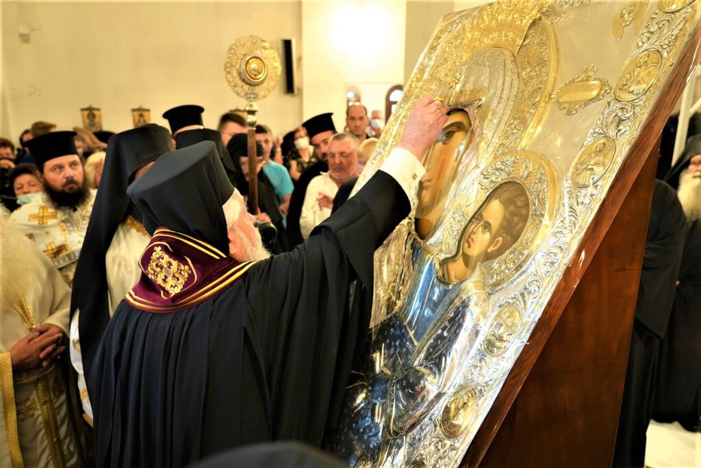 Αμέσως μετά την υποδοχή της αγίας και θαυματουργού Εικόνος, τελέστηκε ενώπιόν Της δοξολογία προς τιμή της Παναγίας μας, της οποίας προεξήρχε ο Μητροπολίτης μας κ. Θεόκτιστος. Ακολούθησαν προσφωνήσεις και ευχαριστίες του σεπτού Ποιμενάρχου μας κ. Θεοκτίστου προς τον άγιο Καθηγούμενο Γέροντα Εφραίμ και προς τους Ουκρανούς Δωρητές Γεώργιο και Μαρίνα. Η δε Γερόντισσα του Ιερού Ησυχαστηρίου μας, στο τέλος των προσφωνήσεων και αφού ευχαρίστησε άπαντες, πρόσφερε δώρα αγάπης και σεβασμού προς τον Γέροντα Εφραίμ και τους Ουκρανούς Δωρητές.