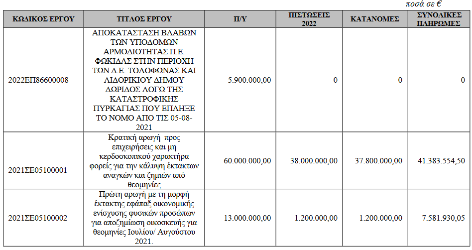 Τα ποσά των αποζημιώσεων και σχετικών χρηματοδοτήσεων από τη καταστροφική πυρκαγιά του 2021 στη Δωρίδα έδωσε στη δημοσιότητα το Υπουργείο Ανάπτυξης και επενδύσεων απαντώντας σε σχετική ερώτηση του Βουλευτή Φωκίδας και Γενικού Γραμματέα της Κοινοβουλευτικής Ομάδας ΝΔ Ιωάννη Μπούγα.