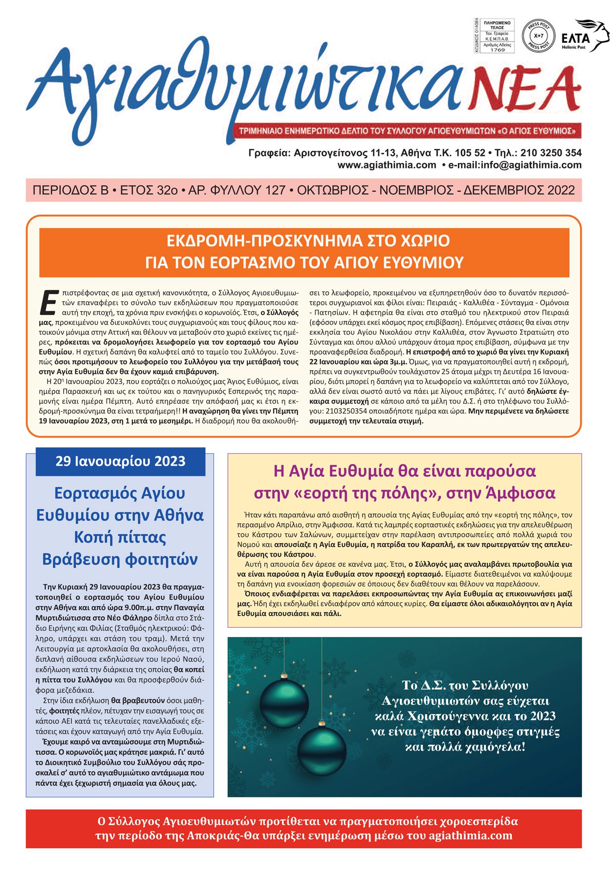 ΑΓΙΑΘΥΜΙΩΤΙΚΑ ΝΕΑ: Κυκλοφόρησε το γιορτινό φύλλο και το Ημερολόγιο 2023 του Συλλόγου Αγιοευθυμιωτών- Εκδρομή προσκύνημα στην Αγία Ευθυμία στις 19/1/2023