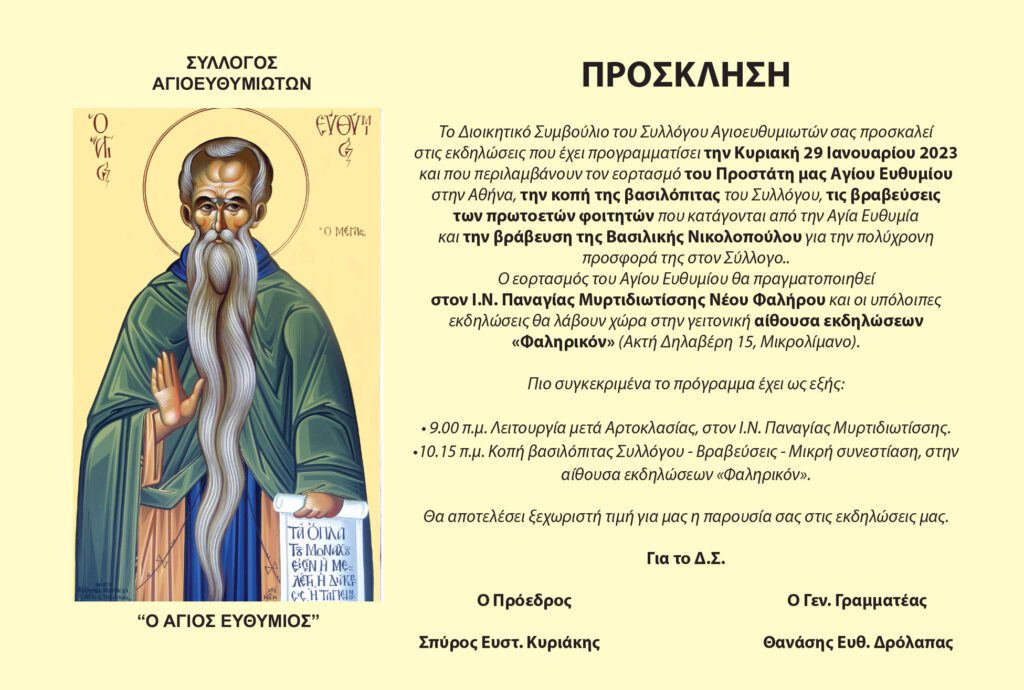 Την Κυριακή 29 Ιανουαρίου 2023 και από ώρα 9.00 π.μ. θα πραγματοποιηθεί μια σειρά από εκδηλώσεις που διοργανώνει ο Σύλλογος Αγιοευθυμιωτών, στο Νέο Φάληρο (Μικρολίμανο).