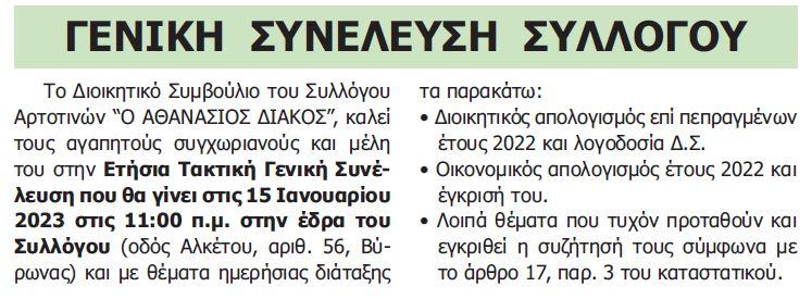 ΑΝΑΚΟΙΝΩΣΗ ΣΥΛΛΟΓΟΥ ΑΡΤΟΤΙΝΩΝ “Ο ΑΘΑΝΑΣΙΟΣ ΔΙΑΚΟΣ”