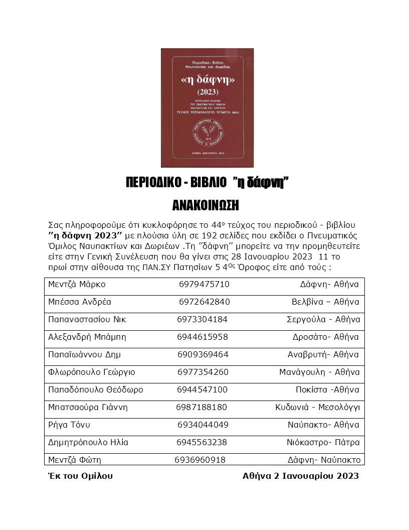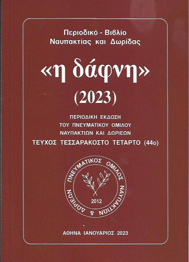 Κυκλοφόρησε το 44ο τεύχος του περιοδικού – βιβλίου “η δάφνη 2023’’ με πλούσια ύλη σε 192 σελίδες που εκδίδει ο Πνευματικός όμιλος Ναυπακτίων και Δωριέων.