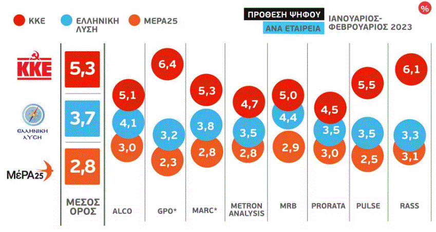ΕΚΛΟΓΕΣ 2023 – Ποσοστά των κομμάτων με το μέσο όρο δημοσκοπήσεων 8 εταιρειών σε Ιανουάριο – Φεβρουάριο