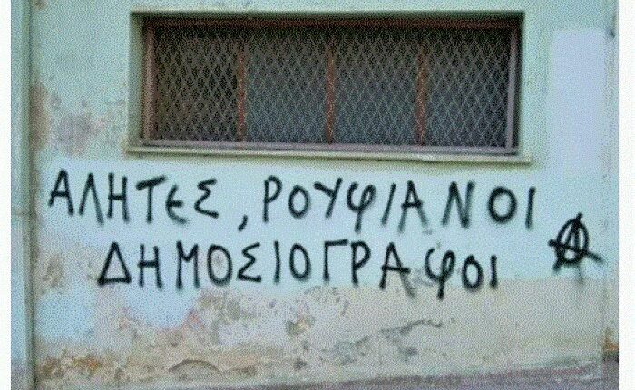 Ομολογώ, το σοκ ήταν ισχυρό. Φυσικά, δεν ήταν το μόνο πλακάτ με «επικηρυγμένο» δημοσιογράφο. Λίγα μέτρα μακρύτερα, στη γωνία Σταδίου και Κολοκοτρώνη, η φρέσκια μπογιά από το σπρέι ακτινοβολούσε τη σκοτεινή της λάμψη: «Αλήτες – ρουφιάνοι – δημοσιογράφοι».