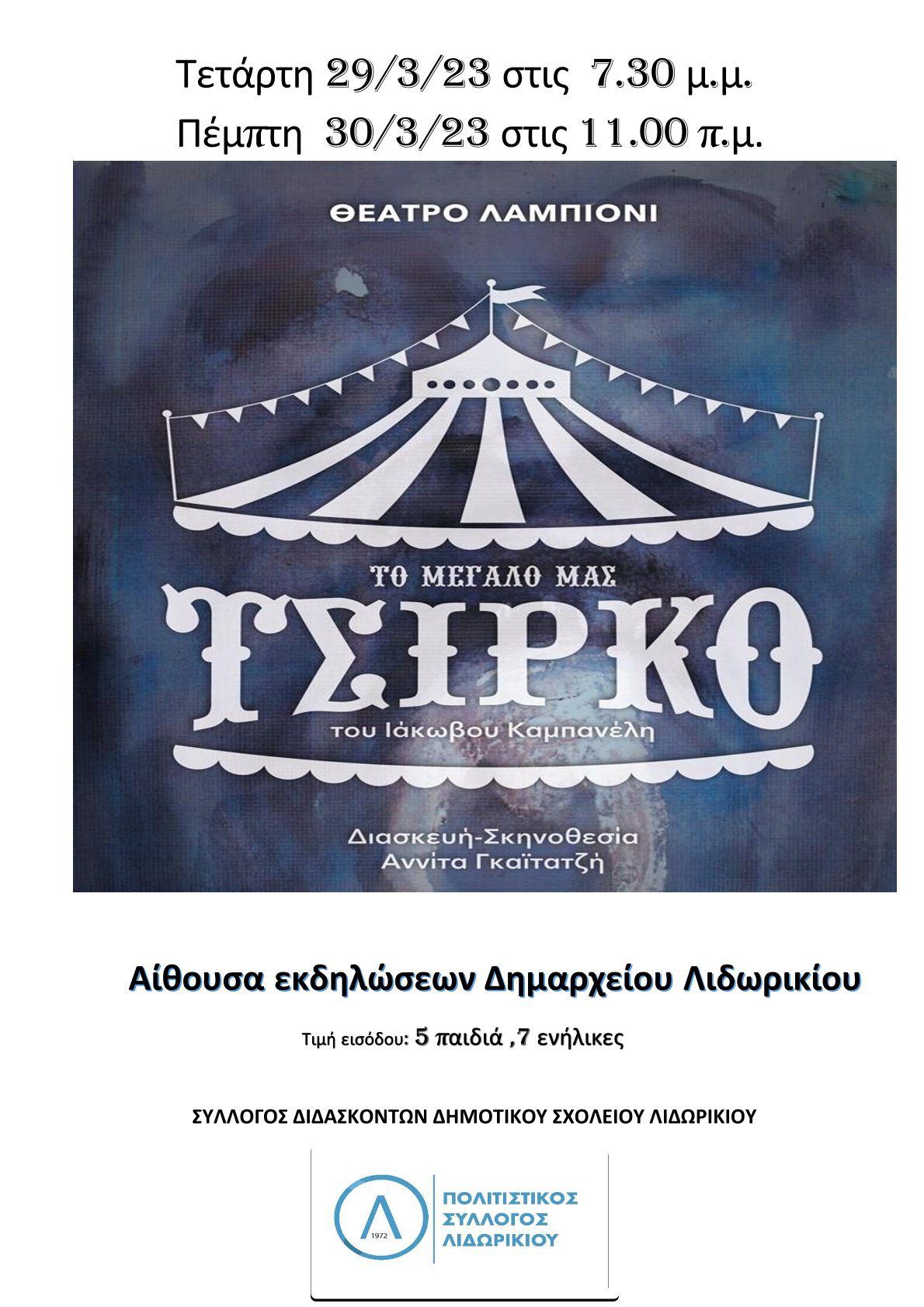 Σήμερα Τετάρτη 29/3 και αύριο η σπουδαία θεατρική παράσταση “Το μεγάλο μας τσίρκο”, στο Λιδωρίκι ΠΟΛΙΤΙΣΜΟΣ Από doridanews Στις Μαρ 29, 2023 Share - Διαφήμιση -Χρόνος ανάγνωσης: 1 λεπτό Συνεχίστε να διαβάσετε- Διαφήμιση - Share