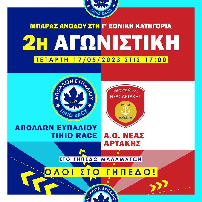Η ομάδα μας αντιμετωπίζει στο πλαίσιο των αγώνων μπαράζ για την άνοδο στη Γ’ Εθνική την 2η αγωνιστική την ομάδα της Νέας Αρτάκη.