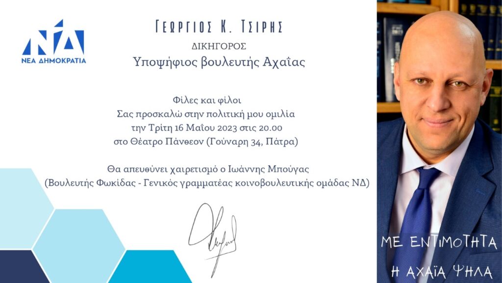 Πρόσκληση του Δωριέα Γιώργου Τσίρη, υποψήφιου με τη ΝΔ, στην κεντρική ομιλία του στο “Πάνθεον” της Πάτρας
