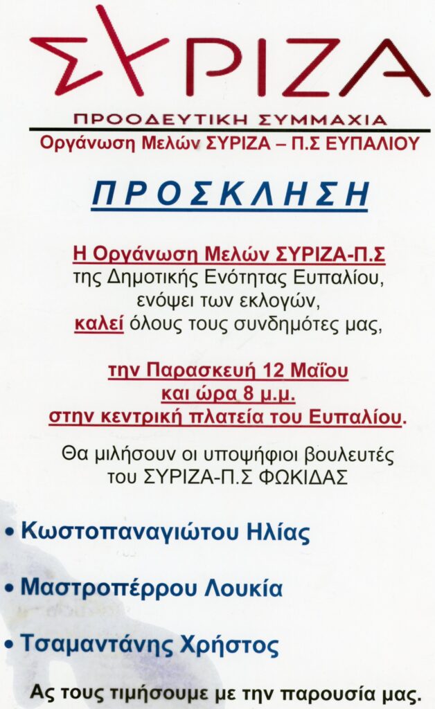 Στο Ευπάλιο την Παρασκευή 12 Μαΐου θα μιλήσουν οι υποψήφιοι βουλευτές του ΣΥΡΙΖΑ-ΠΣ ΕΠΙΚΑΙΡΟΤΗΤΑ Από doridanews Στις Μάι 8, 2023 Share - Διαφήμιση -Χρόνος ανάγνωσης: 1 λεπτό Συνεχίστε να διαβάσετε- Διαφήμιση - Share