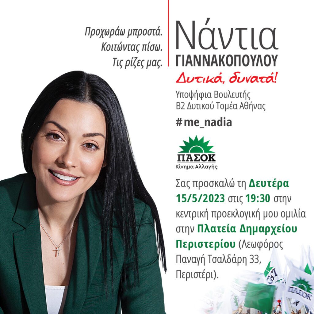 Η βουλευτής του ΠΑΣΟΚ-Κίνημα Αλλαγής στο δυτικό τομέα της Β’ Αθήνας, με μητέρα από την Αρτοτίνα, θα πραγματοποιήσει την κεντρική της προεκλογική ομιλία τη Δευτέρα 15 Μαΐου στις 19:30 στη  πλατεία Δημαρχείου Περιστερίου.