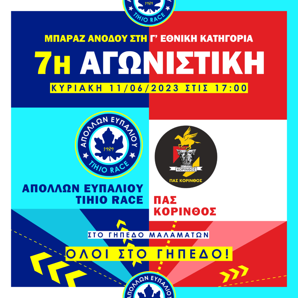 Σε αυτή την τελευταία αγωνιστική των μπαράζ ανόδου στη Γ’ Εθνική κατηγορία ο ΑΠΟΛΛΩΝ ΕΥΠΑΛΙΟΥ TIHIO RACE υποδέχεται στο γήπεδο των Μαλαμάτων την Κυριακή 11 Ιουνίου και ώρα 17:00 την ιστορική ομάδα της Κορίνθου!