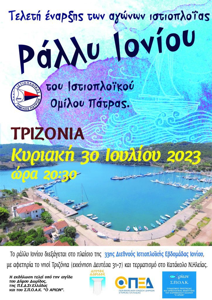 Την Κυριακή 30 Ιουλίου 2023, στις 20.30, στα Τριζόνια, θα πραγματοποιηθεί η Τελετή Έναρξης των Αγώνων Ιστιοπλοΐας «Ράλλυ Ιονίου».