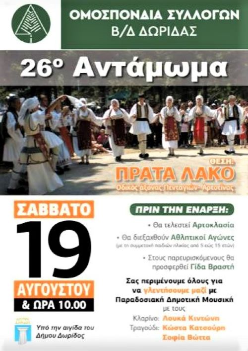 - Σας προσκαλούν στο 26 ο αντάμωμα των Συλλόγων Β/Δ Δωρίδας το Σάββατο 19 Αυγούστου 2023 και ώρα 10.00 π.μ στου Πρατά – Λάκο.
