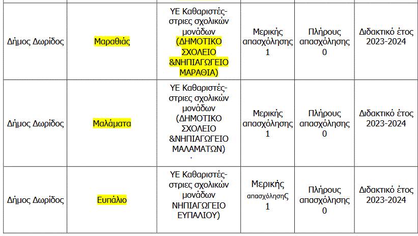 Την πρόσληψη, με σύμβαση εργασίας ιδιωτικού δικαίου ορισμένου χρόνου, συνολικά έξι (06) ατόμων για  την καθαριότητα σχολικών μονάδων στο Δήμο Δωρίδος, και συγκεκριμένα, ανά υπηρεσία, έδρα, ειδικότητα, αριθμού ατόμων  και διάρκεια σύμβασης, ανακοίνωσε ο Δήμαρχος Γιώργος Καπεντζώνης.