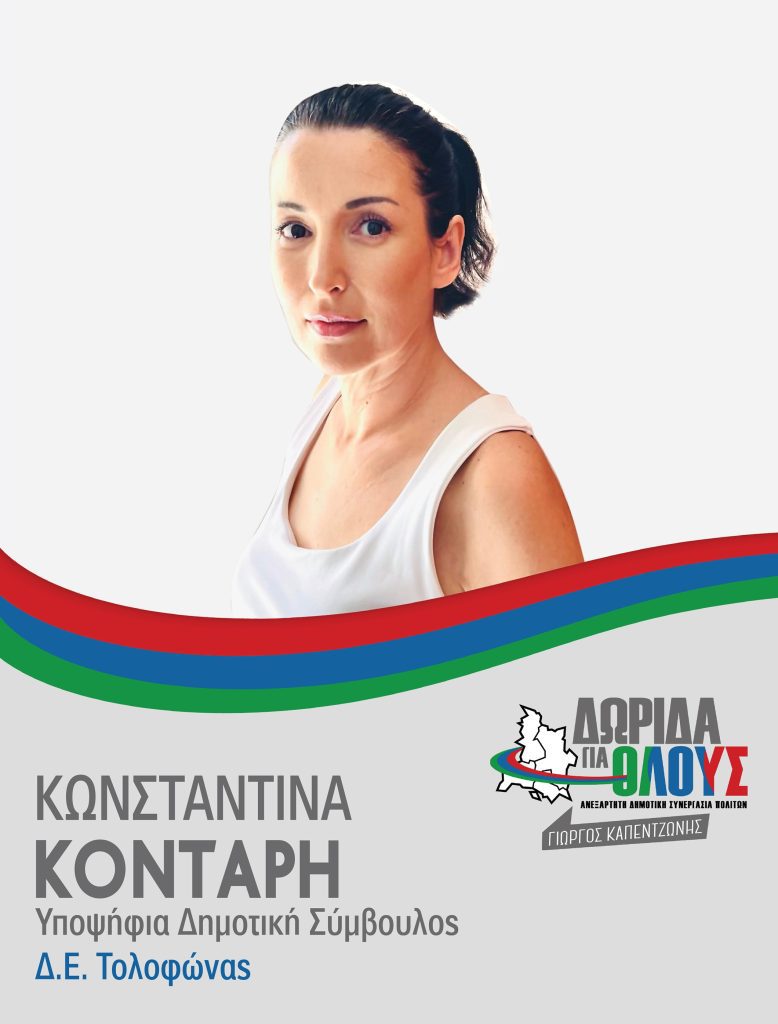Μακριά από χρώματα και κόμματα, σε μια προσπάθεια να δω τον Δήμο Δωρίδος που ονειρεύομαι, που ονειρεύεται ένας νέος άνθρωπος, συστρατεύομαι με τον νυν και εκ νέου υποψήφιο, για τη θέση του Δήμαρχου, Κο Γεώργιο Ν. Καπεντζώνη, ως υποψήφια Δημοτική Σύμβουλος με τον συνδυασμό «ΔΩΡΙΔΑ για ΟΛΟΥΣ», θέλοντας και εγώ να βοηθήσω όσο μπορώ, μέσα από μια φρέσκια ματιά, στην λύση των προβλημάτων του Δήμου όπου ζω και εργάζομαι.