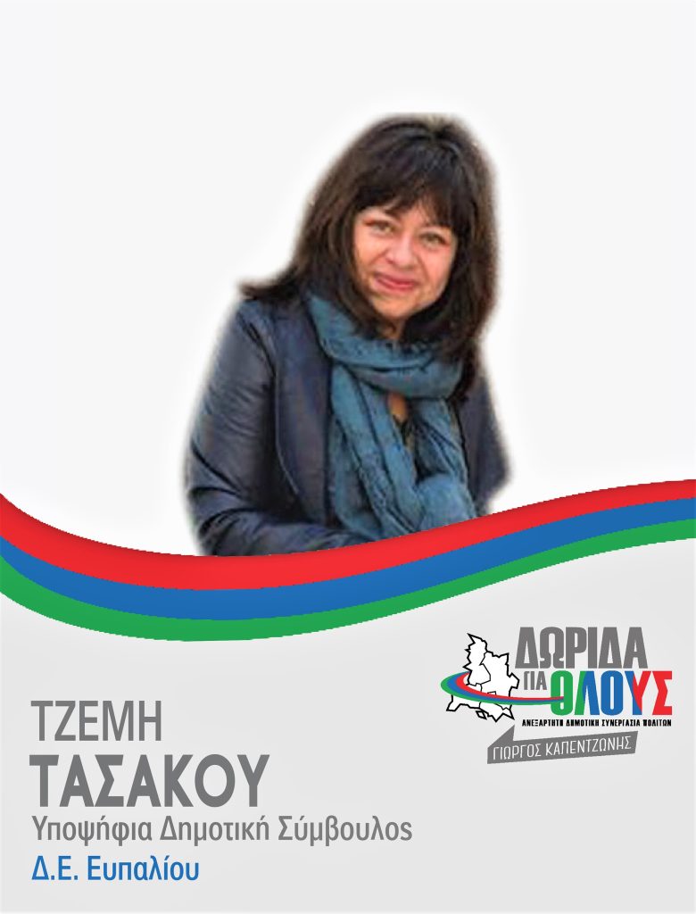 Την υποψηφιότητα της Τζέμης Τασάκου στις δημοτικές εκλογές του Οκτωβρίου στη Δημοτική Ενότητα Ευπαλίου ανακοίνωσε ο συνδυασμός “Δωρίδα για Όλους”.