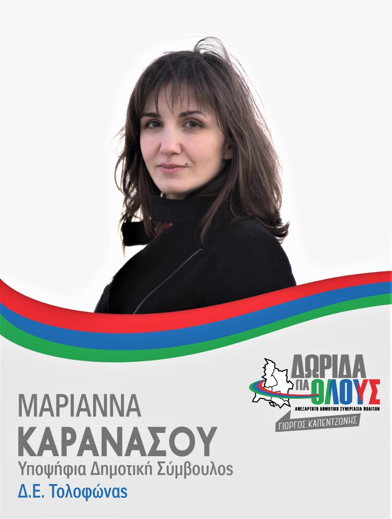 Την υποψηφιότητα της Μαριάννας Καρανάσσου στιςδημοτικές εκλογ΄λες του Οκτωβρίου στη δημοτική ενότητα Τολοφώνας ανακοίνωσε ο συνδυασμός “Δωρίδα γι Όλους”