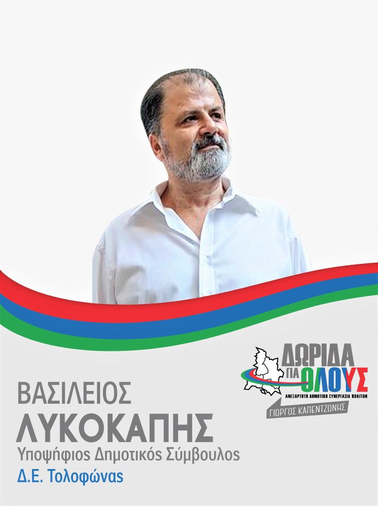 Την υποψηφιότητα του Βασίλη Λυκοκάπη στις δημοτικές εκλογές του Οκτωβρίου στη Δημοτική Ενότητα Τολοφώνας ανακοίνωσε ο συνδυασμός “Δωρίδα για Όλους”,