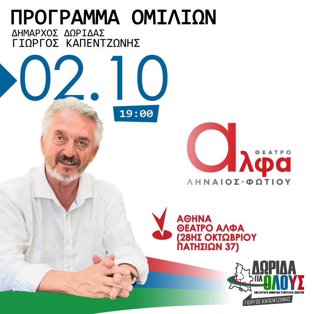 Στην Αθήνα στο θέατρο ΑΛΦΑ, Πατησίων 37, θα μιλήσει σήμερα Δευτέρα στις 7:00 το απόγευμα ο Δήμαρχος κι υποψήφιος δήμαρχος Δωρίδας Γιώργος Καπεντζώνης