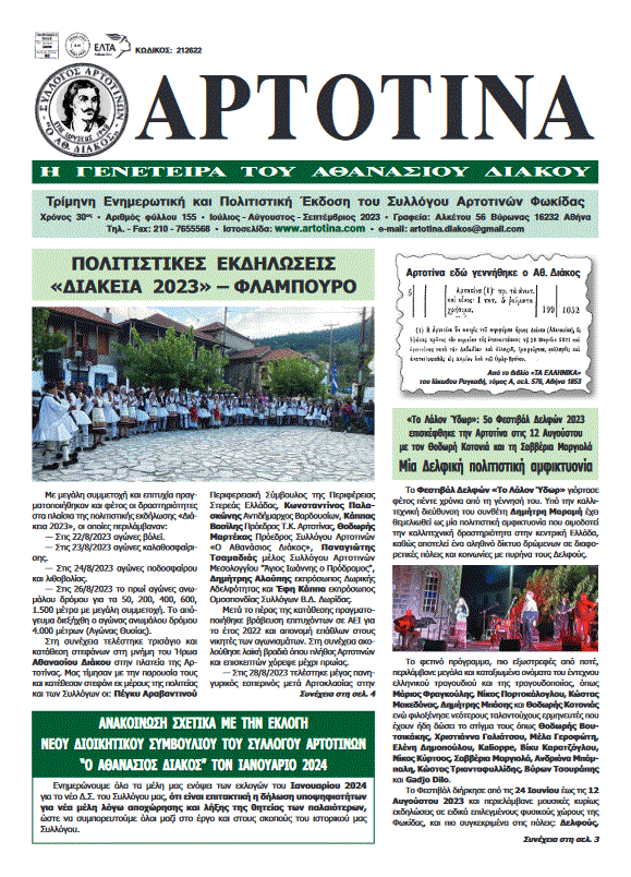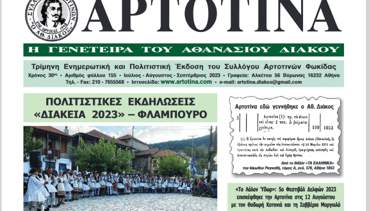 Κυκλοφόρησε με πλούσια ύλη το νέο φύλλο της εφημερίδας “ΑΡΤΟΤΙΝΑ” που εκδίδει ο Σύλλογος Αρτοτινών Φωκίδας στην Αθήνα.